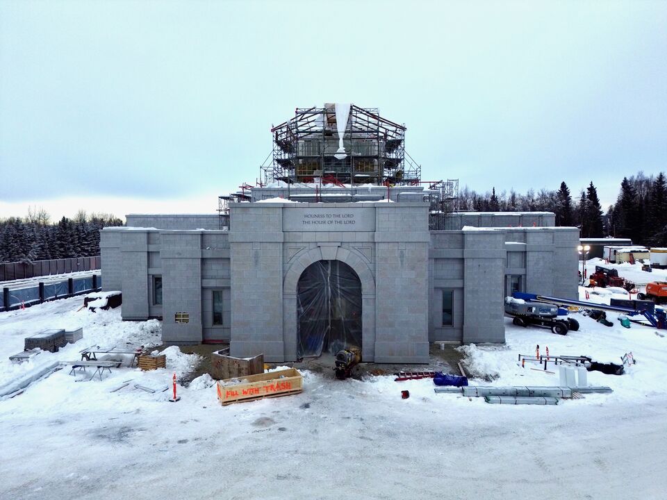The scaffolding and plastic sheeting that stood in front of the entrance to the Anchorage Alaska Temple has been removed, revealing the Holiness to the Lord panel that was installed over the arched entryway. At the southwest corner of the temple, an opening has been left for the cornerstone that will be inscribed with the year that the temple is dedicated. The new temple will replace the original temple that still operates at the southeast corner of the property.
