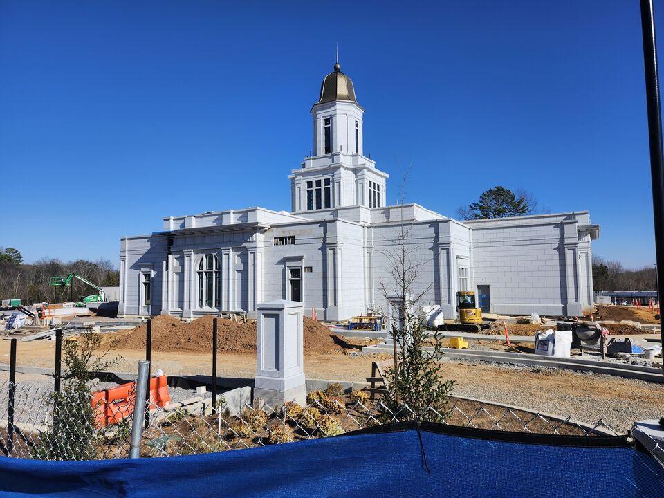 Standing tall against a backdrop of deep blue skies, the classically detailed granite-clad walls of the Knoxville Tennessee Temple evoke a sense of quiet dignity and serene symmetry. In the foreground, the work of landscaping moves forward with the installation of fencing, curbing, and walkways, while trees and plants are established in the flowerbeds. Even amid construction, the temple’s noble silhouette speaks to the building's spiritual purpose.