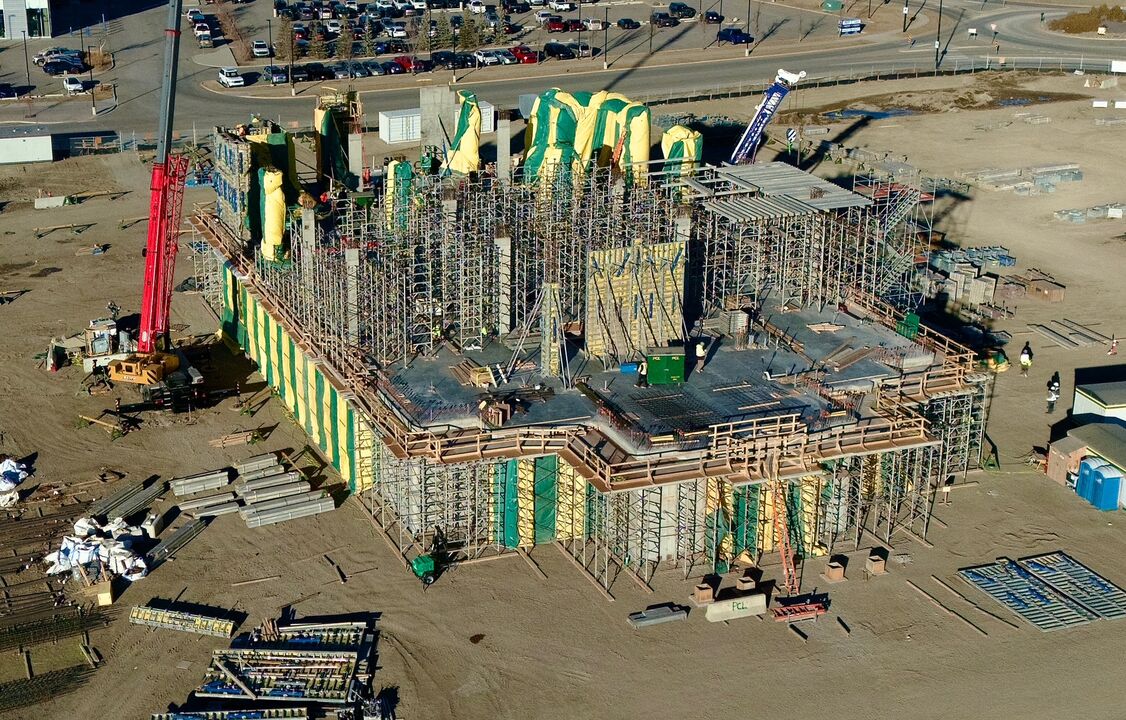 The load-bearing concrete walls and columns for the second story of the Lethbridge Alberta Temple are being poured and cured. Brightly colored tarps are placed over the newly poured structures to regulate the temperature for proper curing. The temple has been under construction for 9 months in the city of Lethbridge, which was named after William Lethbridge, the first president of the North Western Coal and Navigation Company.
