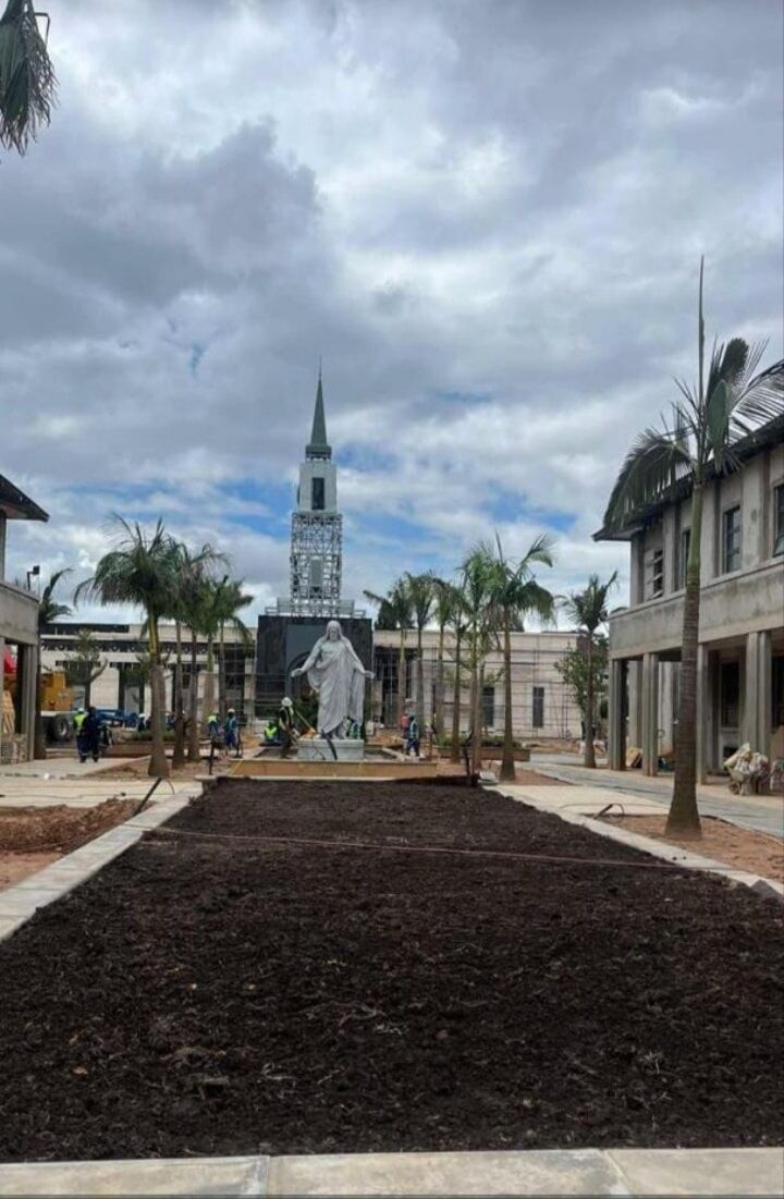 On the grounds of the Lubumbashi Democratic Republic of the Congo Temple, a marble reproduction of Bertel Thorvaldsen's Christus statue has been set in place. Standing in front of the temple entrance, directly below the recently installed spire, the sculpture will be the focal point of the property—a reminder that Jesus Christ is the focal point of our lives. In front of the statue, a long, narrow flowerbed has been prepared for planting.