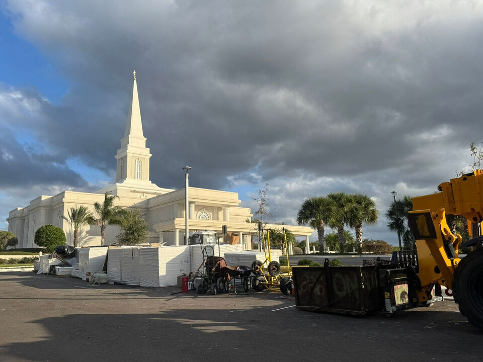 Construction equipment and materials are staged in the northwest parking lot of the Orlando Florida Temple where extensive renovations of the interior are progressing. Florida's first temple was announced in February 1990 and constructed in the Orlando suburb of Windermere. Known as the "Theme Park Capital," Orlando attracts millions of tourists annually, boasts over 100 lakes, and was once the hub of the state's citrus industry.
