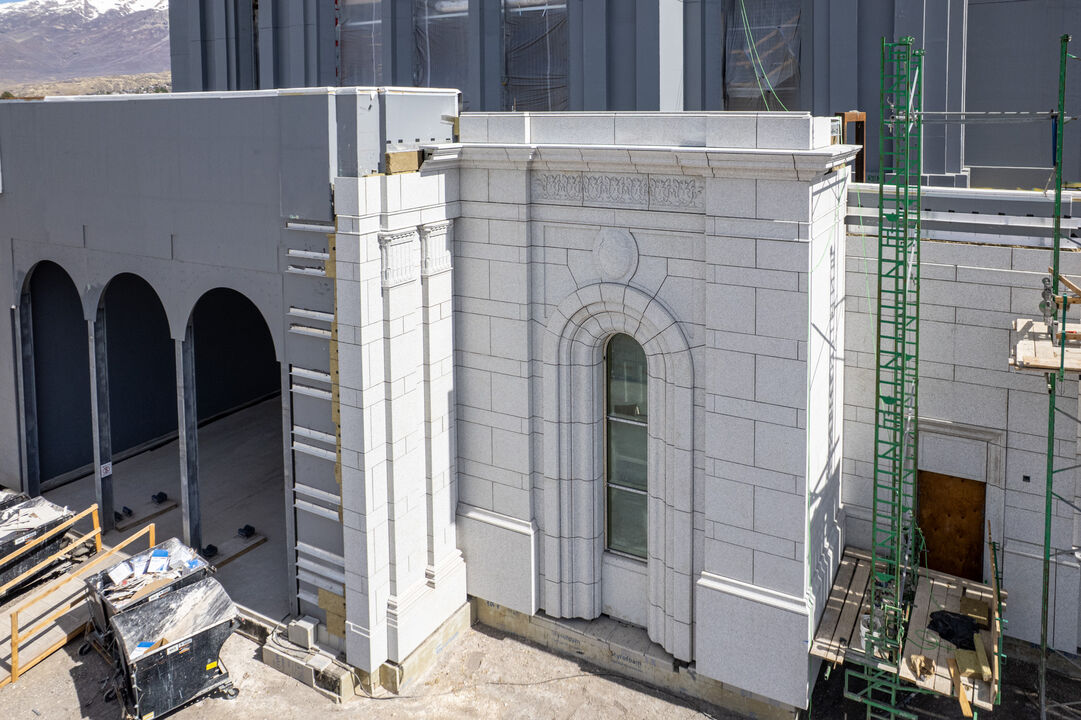 Cladding of the Provo Utah Rock Canyon Temple with granite panels has progressed to the south side of the front portico on the west elevation of the building. Each panel is carefully engineered, precisely cut, and labeled for placement. The design incorporates classical detailing, including cornices, pilasters, keystones, and ornamented pieces. Installation of the stone anchors has begun across the portico.