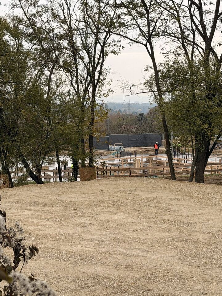 A chain-link construction fence has been erected around the Budapest Hungary Temple site where heavy equipment is grading and leveling the ground, and drilling for the foundation has started. Signage has been posted, and the construction office is in place. The groundbreaking ceremony for the temple was held just over a month ago under the direction of Elder Rubén V. Alliaud.