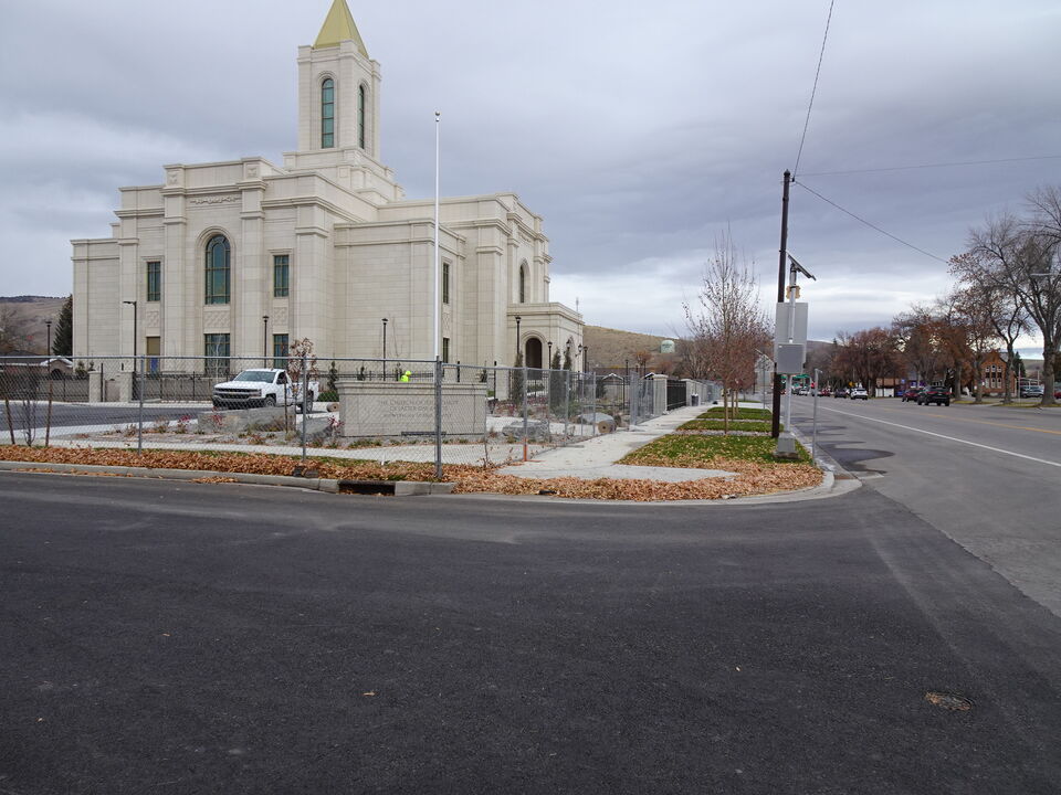 The construction fence along Washington Street in front of the Montpelier Idaho Temple has been relocated behind the sidewalk, restoring access to pedestrians. The lettering on the monument sign and Holiness to the Lord panel at the top of the portico has been painted, and the parking lot has been recently paved, striped, and posted with signage, while finish work continues on the interior.