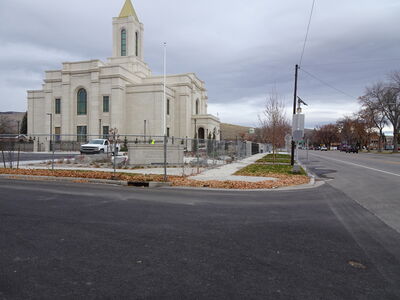 On the north side of the Montpelier Idaho Temple, the final pieces of exterior cladding are being set in place. On the south side, the front steps leading to the main entrance have been poured and cured, and the stone-clad hardscape is being grouted. Large deliveries of potted flowers have been staged on site for planting, while trees are being established across the grounds. No dates have been announced for the dedication, but it is anticipated to take place in 2026.