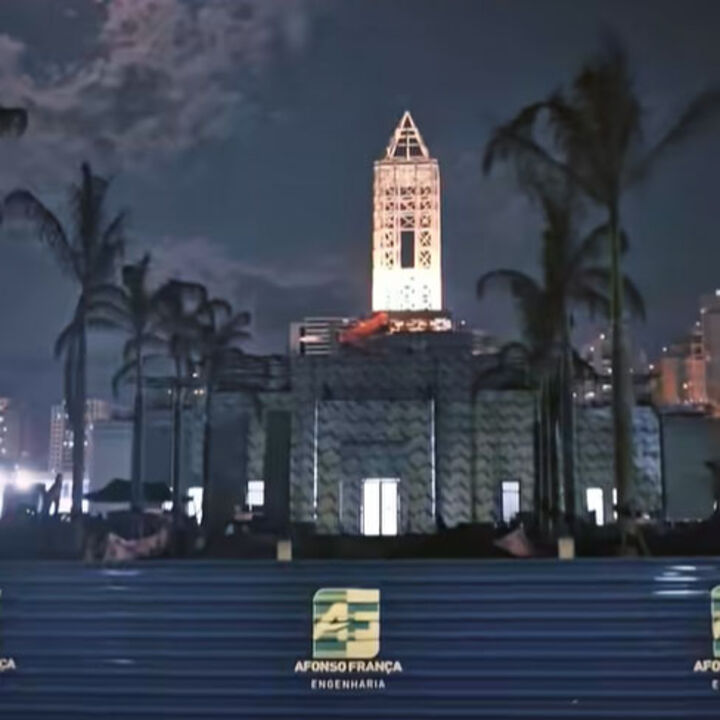 The steel framework for the steeple of the Ribeirão Preto Brazil Temple is lit at night, creating a beautiful vista for passers-by. The majority of the temple has been clad with stone, leaving work to be done on the west (front) side, mezzanine level, and steeple. Statuesque palm trees stand in two lines on either side of the entrance plaza. Construction has progressed rapidly for over 15 months.