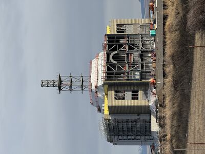 Construction temporarily delayed; concrete structural frames in place for temple and ancillary building; window openings shuttered